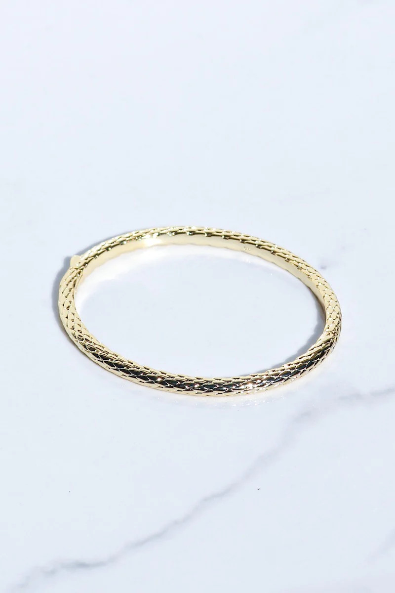 This bold bangle features a textured embossed python print, offering a unique and edgy twist on a classic design. The sleek, smooth finish complements the intricate pattern, making it a standout accessory that adds both style and sophistication to any look.