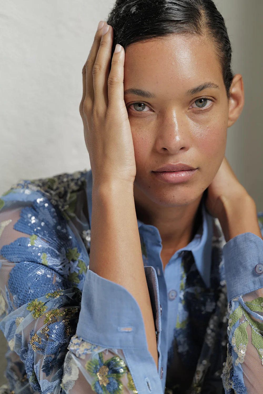 This long-sleeve blouse features an all-over botanical embroidery rendered in intricate beadwork and sequins across a sheer mesh foundation. Oversized blooms — including daisies, chrysanthemums, and leafy sprigs — are brought to life in a garden-fresh palette of powder blue, ivory, sage green, and champagne gold, with shimmering sequin accents that catch the light with every movement.