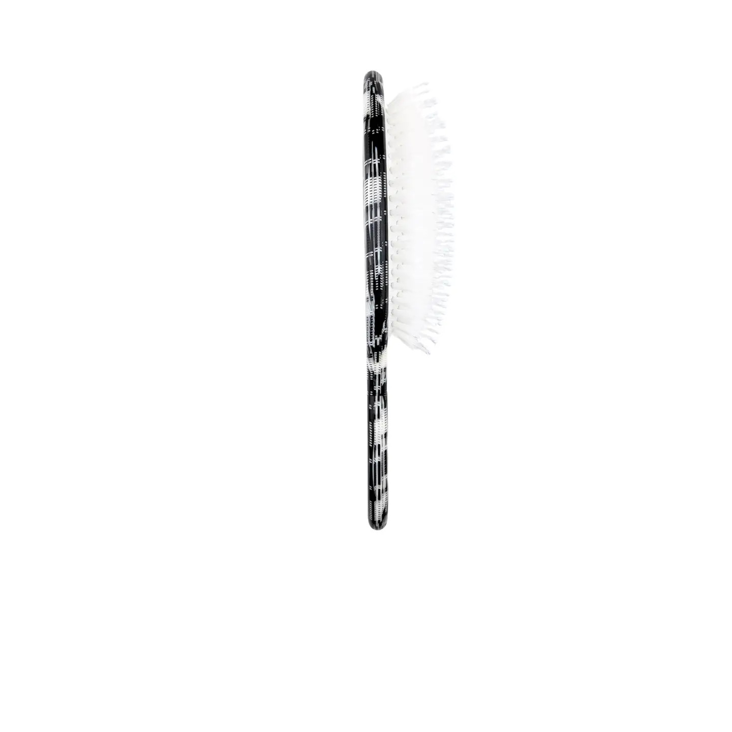 Vegan boar-like bristles distribute natural oils and smooth hair, while flexible pins gently detangle and massage the scalp.