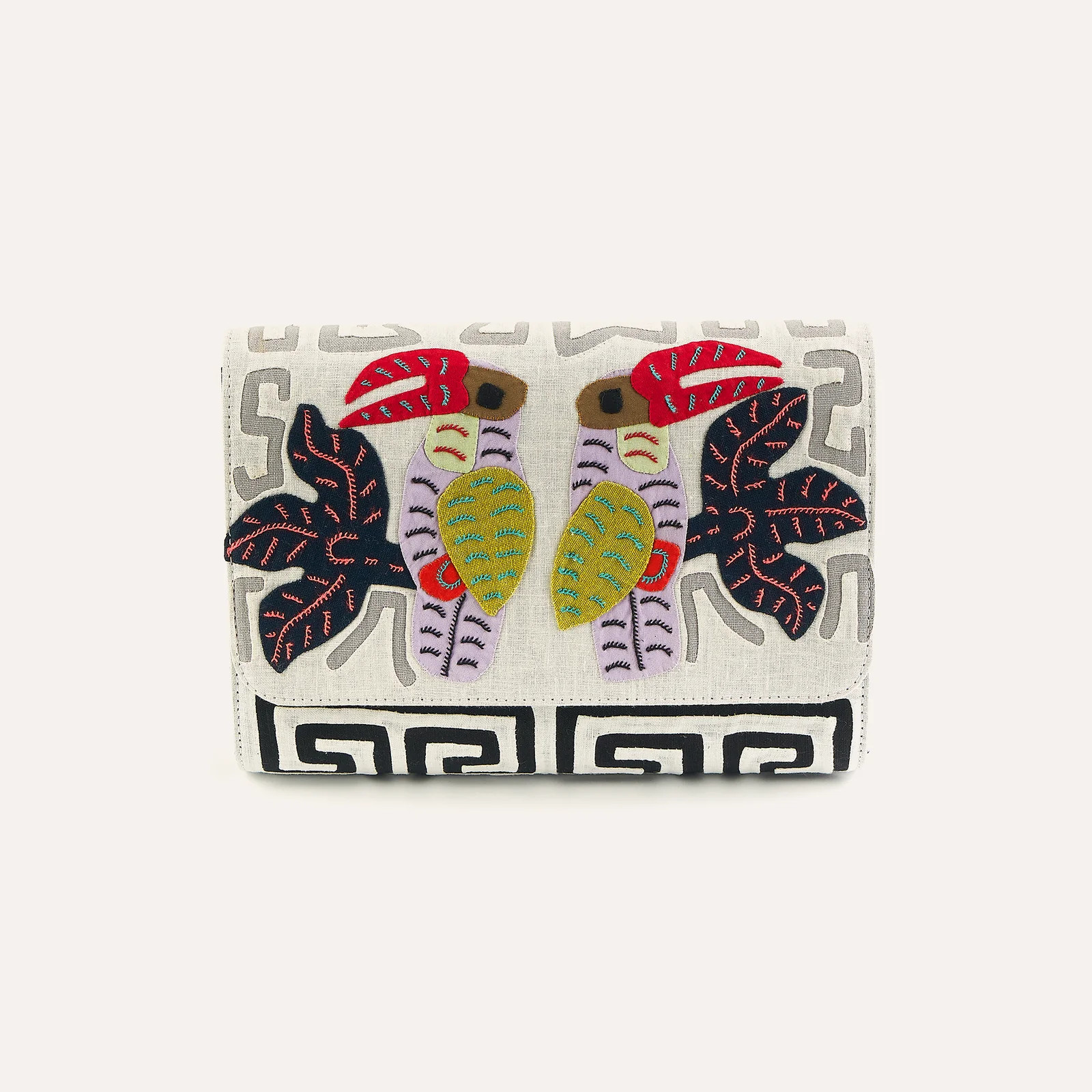 Inspired by the lush jungles of Colombia, where wild parrots fly and sing in harmony with other tropical creatures, this playful clutch celebrates the vibrant life of the rainforest. Part of our Tropical Collection, the Lorito design features two mirrored white parrots, a striking and joyful motif that captures the essence of exotic escapes and sun-filled adventures.