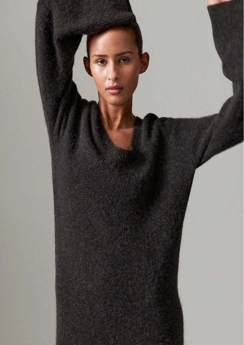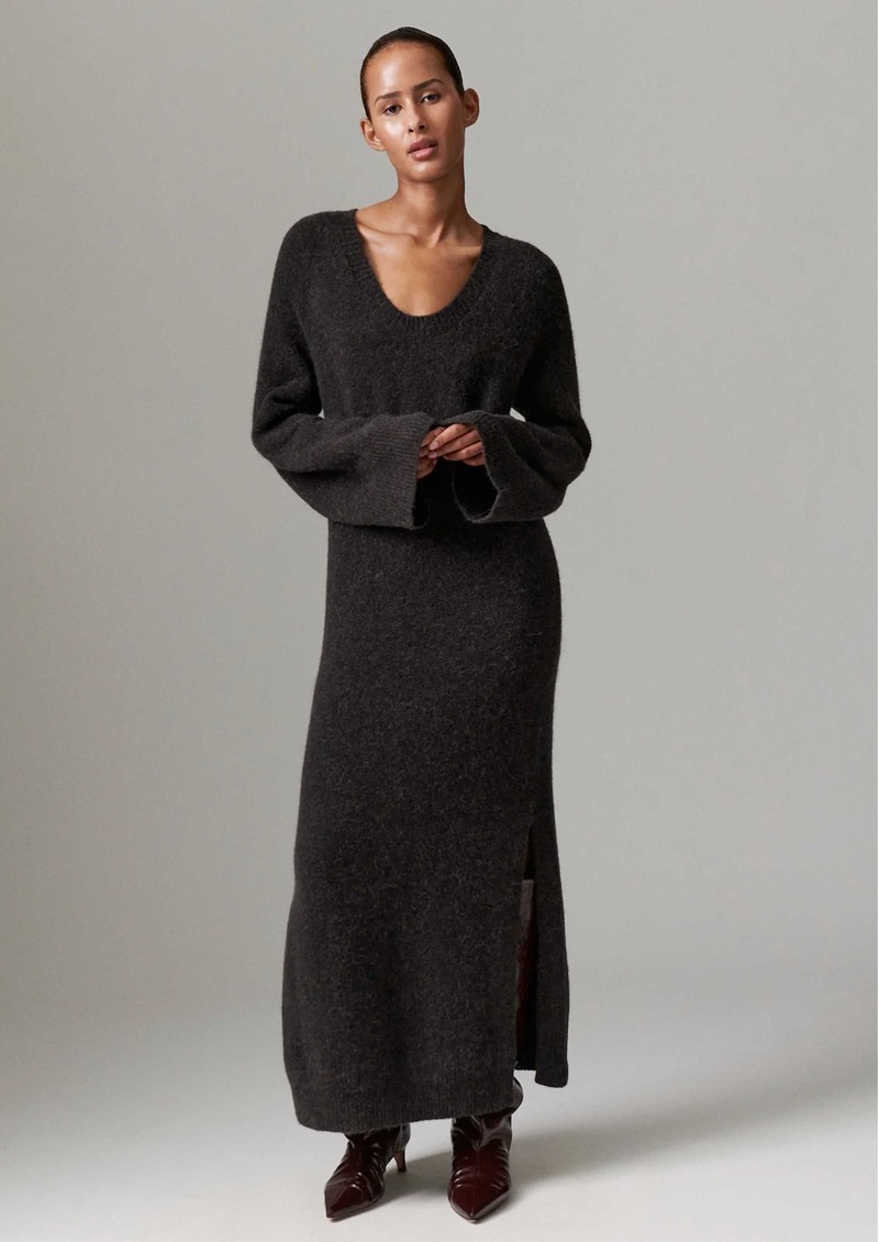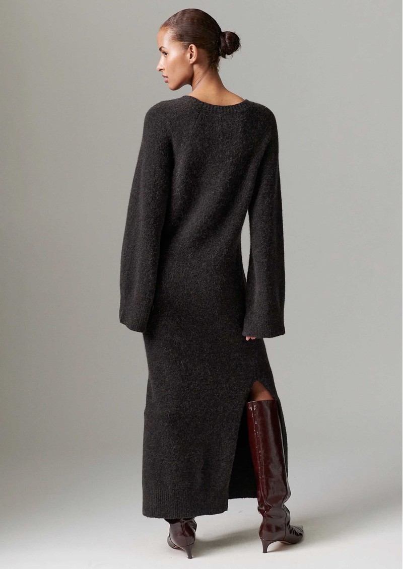 Stay cosy and stylish with the Day Birger Et Mikkelsen Mills Alpaca Blend Dress in a rich espresso hue. This stretchy, ankle-length sweater dress features a deep U-shaped neckline, side slits, and a fitted silhouette, combining comfort with elegant shape.