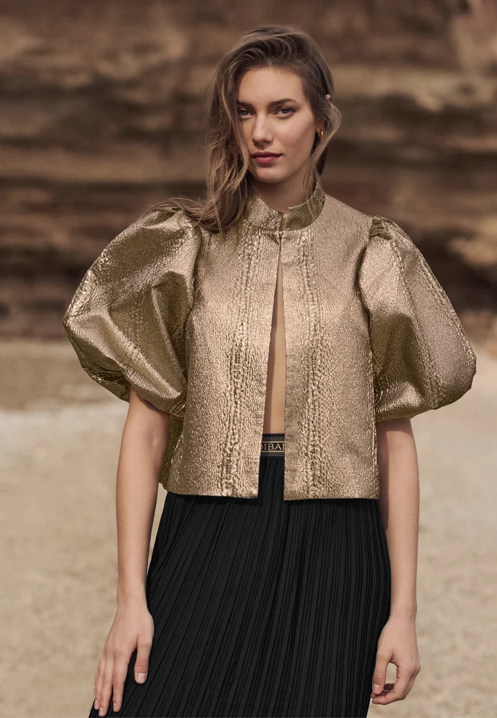 With its bold, sculptural silhouette, this jacket is the perfect option for evening. It has large balloon sleeves and a high collar and is fastened at the neck with a hook and eye with hidden pockets in the side seams. This elegant version is in a luxurious burnished gold jacquard.