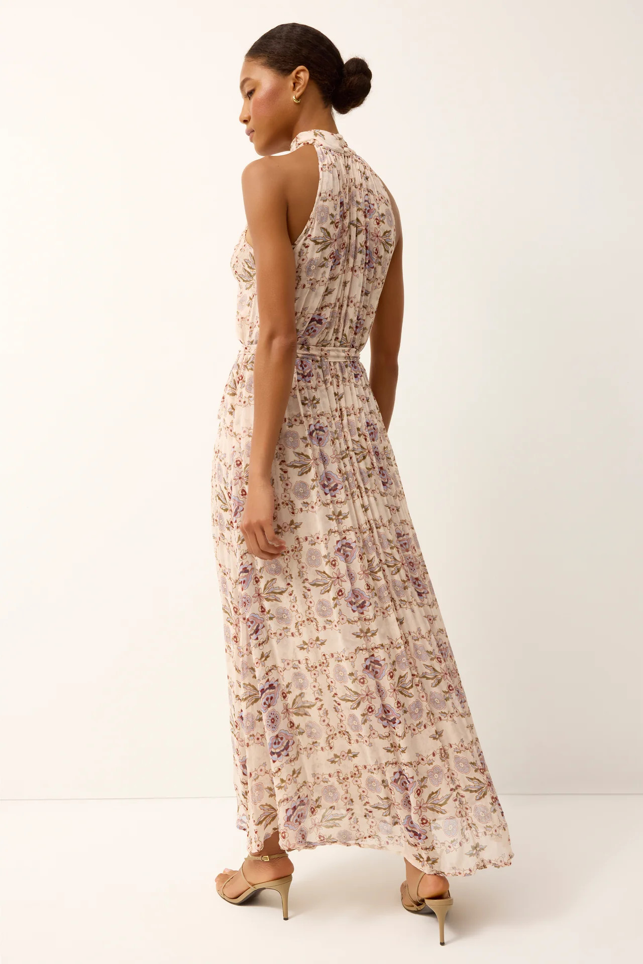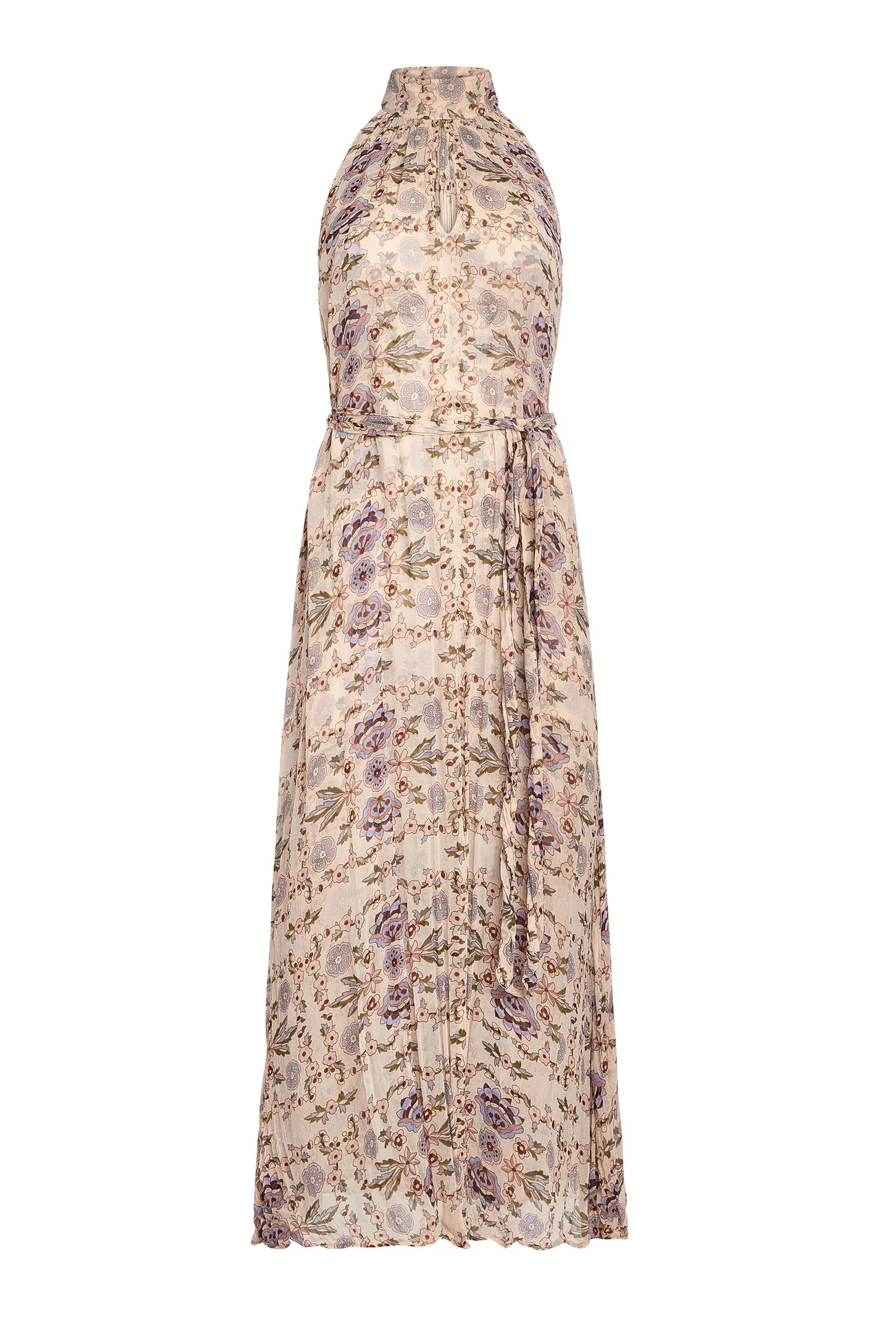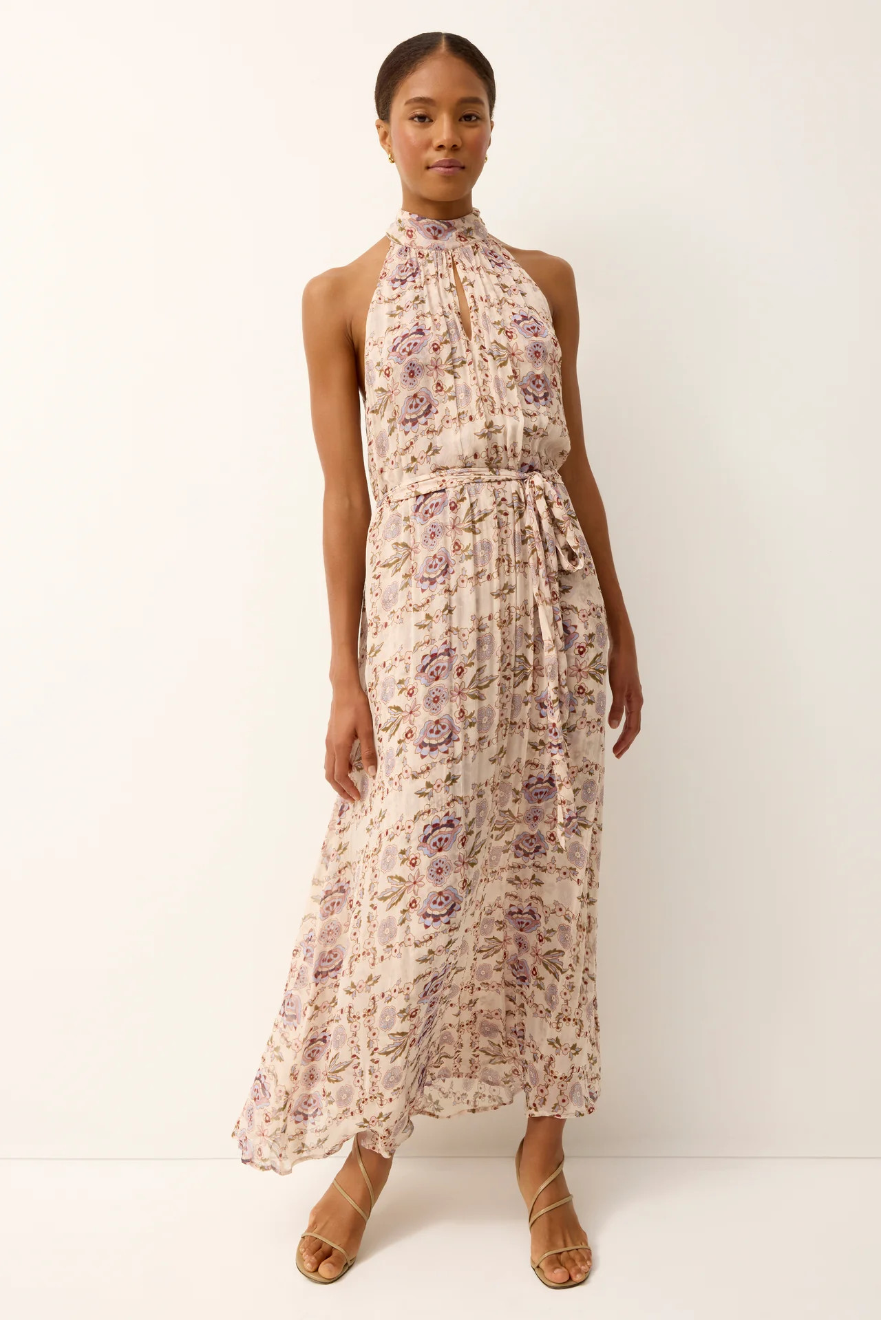 Our Penelope dress returns for spring in the Garden floral print, offering a romantic statement silhouette with timeless appeal. Designed with a halter-style neckline and subtle keyhole detail, this pleated maxi shape drapes beautifully over the body and is finished with an optional sash belt for added definition. Light, relaxed, and easy to wear, Penelope transitions seamlessly from spring events to summer evenings, pairing just as effortlessly with simple sandals by day as it does with heels for more polished occasions.