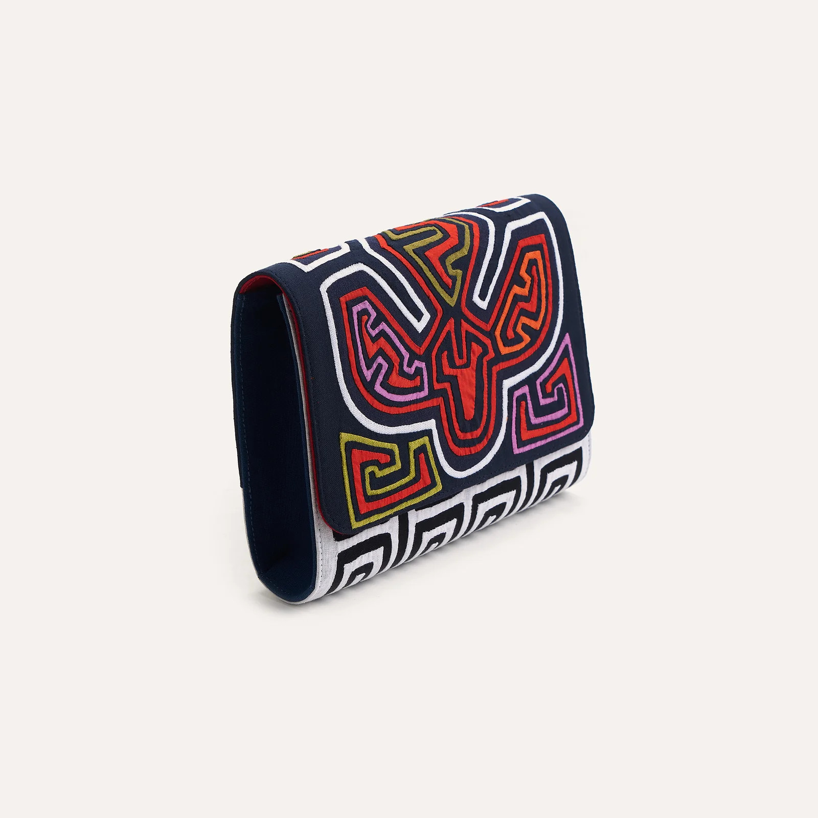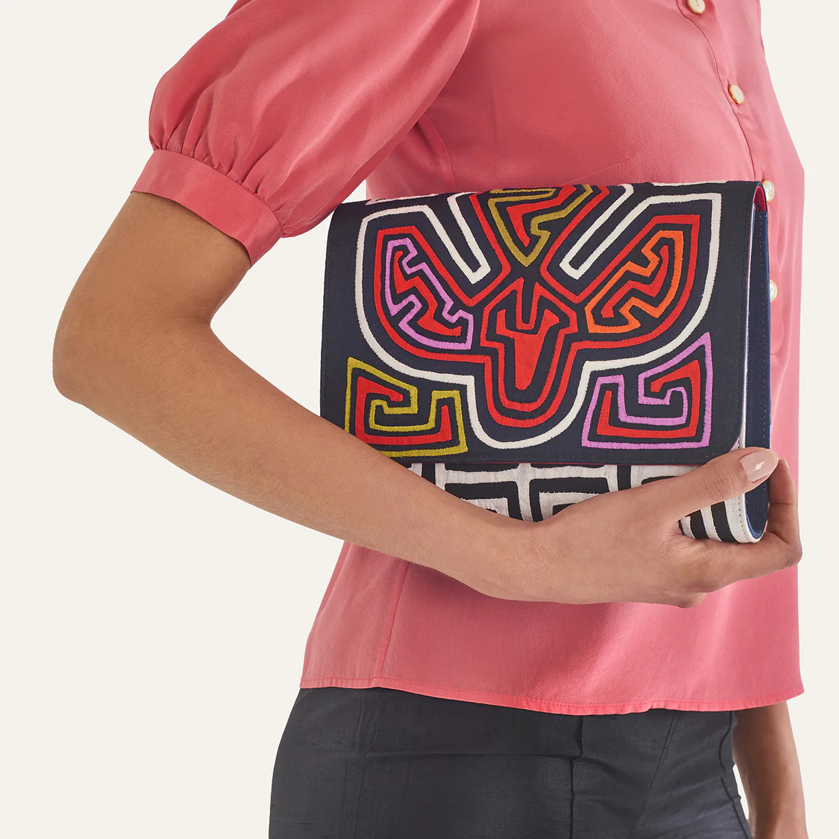 Inspired by a majestic bird motif from our vintage textile collection sourced in Panama, this clutch pairs a rich navy abstract design with crisp white and navy on the bottom, classic colors in Gunadule textiles. The navy cotton twill sides add a refined, understated finish that balances the vibrant pattern.