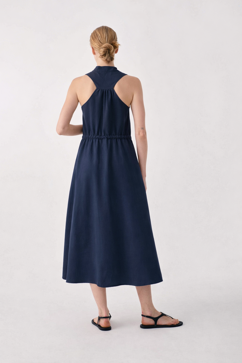 Sleeveless long dress featuring a V-neckline and front button fastening. The drawstring waist enhances the fluid silhouette of the design. Made in Italy.
