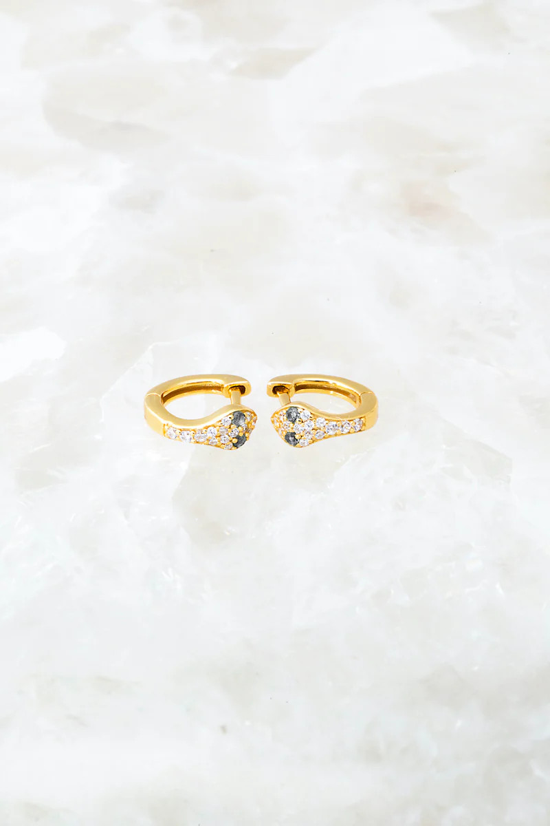 Tiny snake 14K gold vermeil huggie earrings with sparkling gray eyes.