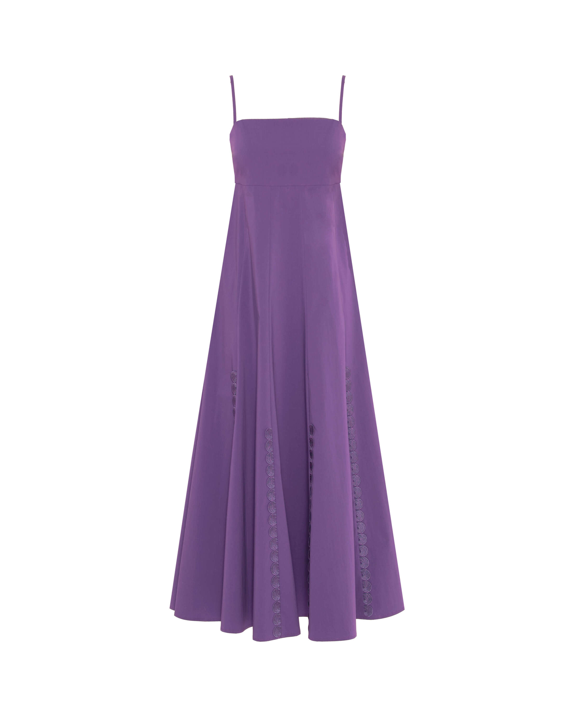 Long poplin dress with a straight neckline and thin straps. The flared shape is enhanced by vertical openwork embroidery that adds lightness and movement to the silhouette. A feminine and refined piece, perfect for the summer season. Made in Italy.